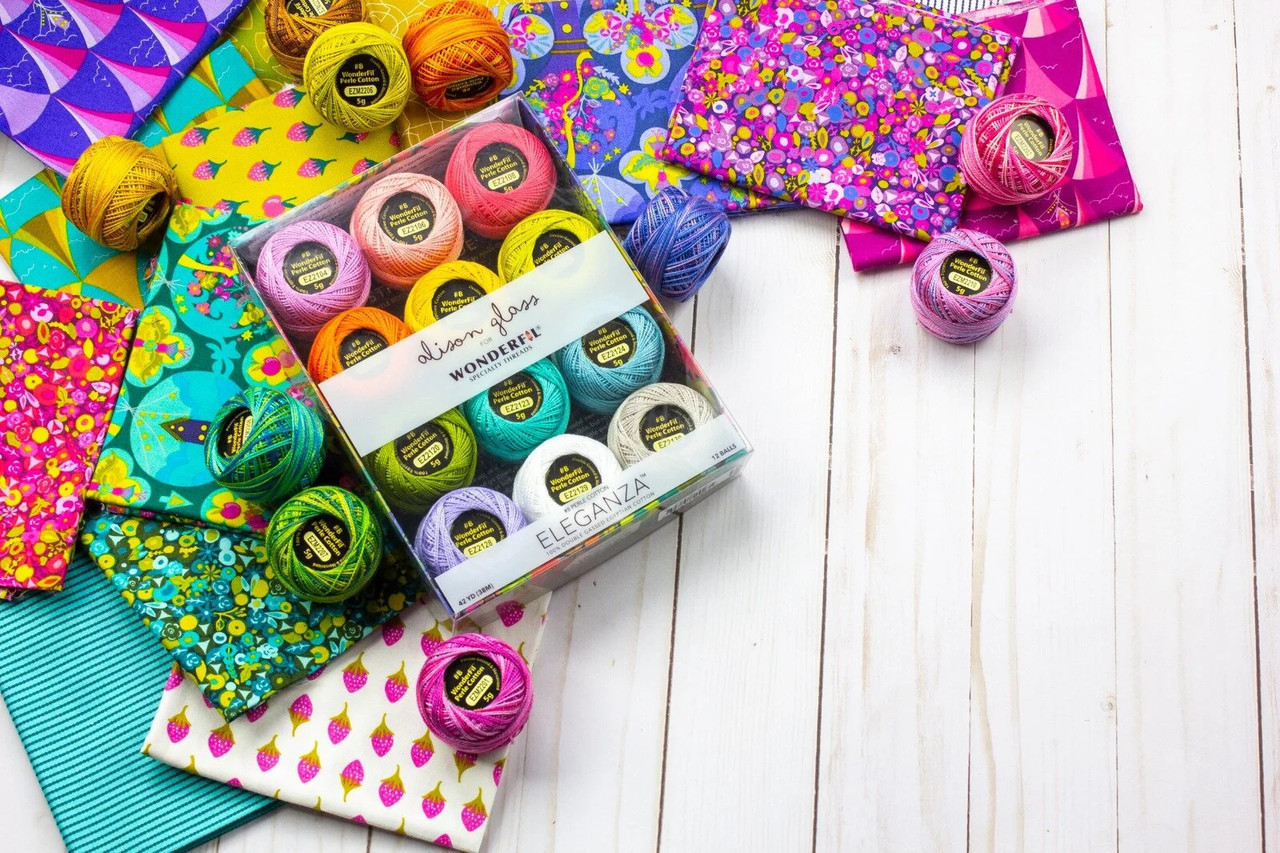 The Alison Glass Collection of Eleganza™ by Wonderfil©, is a gorgeous 8wt, 2-ply 100% coton (Long staple Egyptian cotton) thread that is double-gassed* and mercerized, resulting in a wonderfully smooth and lustrous surface that allows the thread to glide beautifully through all types of fabrics and fibers. The thread’s tight twist creates beautifully firm stitches while its surface sheen produces a luxurious finish to embellishment stitchery.