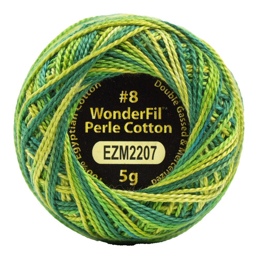 The Alison Glass Collection of Eleganza™ by Wonderfil©, is a gorgeous 8wt, 2-ply 100% coton (Long staple Egyptian cotton) thread that is double-gassed* and mercerized, resulting in a wonderfully smooth and lustrous surface that allows the thread to glide beautifully through all types of fabrics and fibers. The thread’s tight twist creates beautifully firm stitches while its surface sheen produces a luxurious finish to embellishment stitchery.