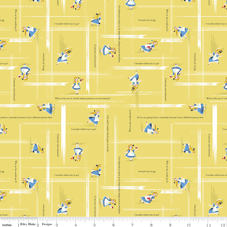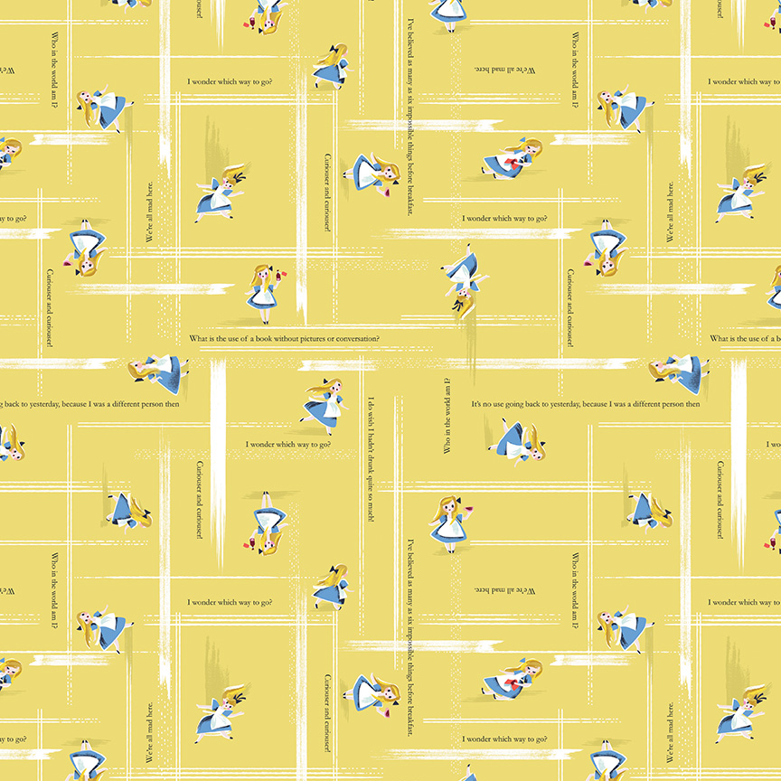 Join Alice as she navigates risks and challenges transitioning from childhood to adolescence in Jill Howarth's newest designer fabric collection, Down the Rabbit Hole for RILEY BLAKE DESIGNS. You'll love the mischievous palette of blush, rose, yellow, bleached denim and navy. The collection features delightful prints showcasing those oh-so famous characters, tea party shenanigans and much more.