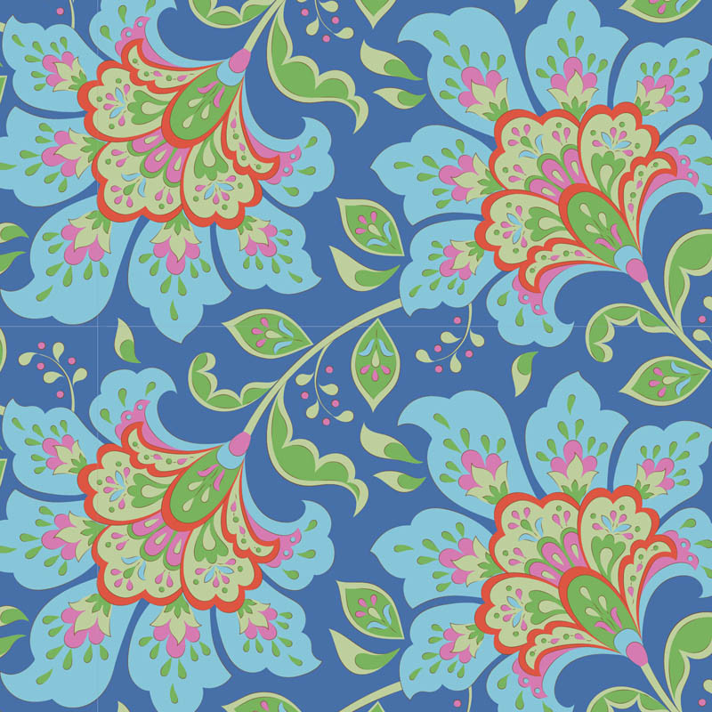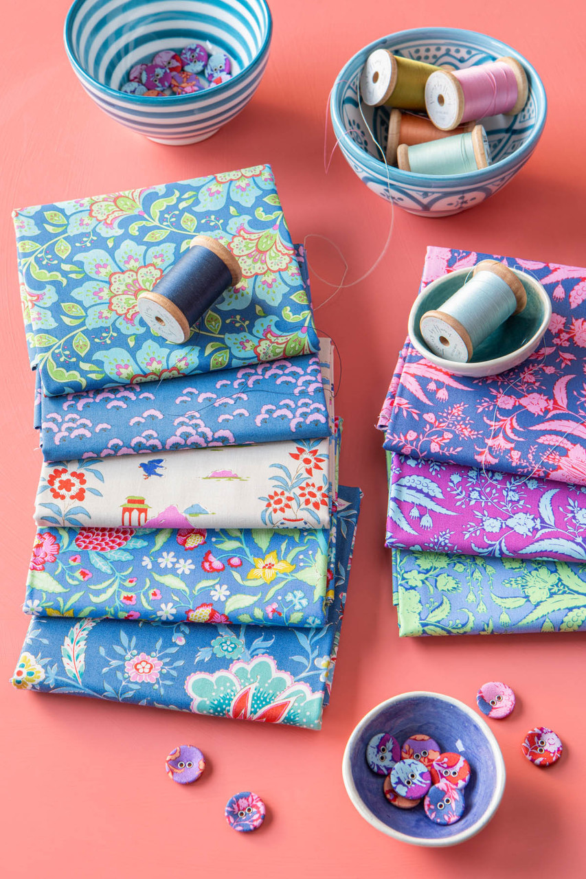 Bloomsville is an explosion of bright colors and flowers in bloom, perfect for summer projects. The feature design Garden Vista is inspired by old chinoiseries and a sweet motif found on a vase from a factory that closed in the 1960s. Ideal for small decorative pillows, bags and fun details in a quilt. The bold flower motif of Late Bloomer takes inspiration from Indian chintz with large imaginative flowers that are easy to cut into, making the pattern work well for both large and small pieces."