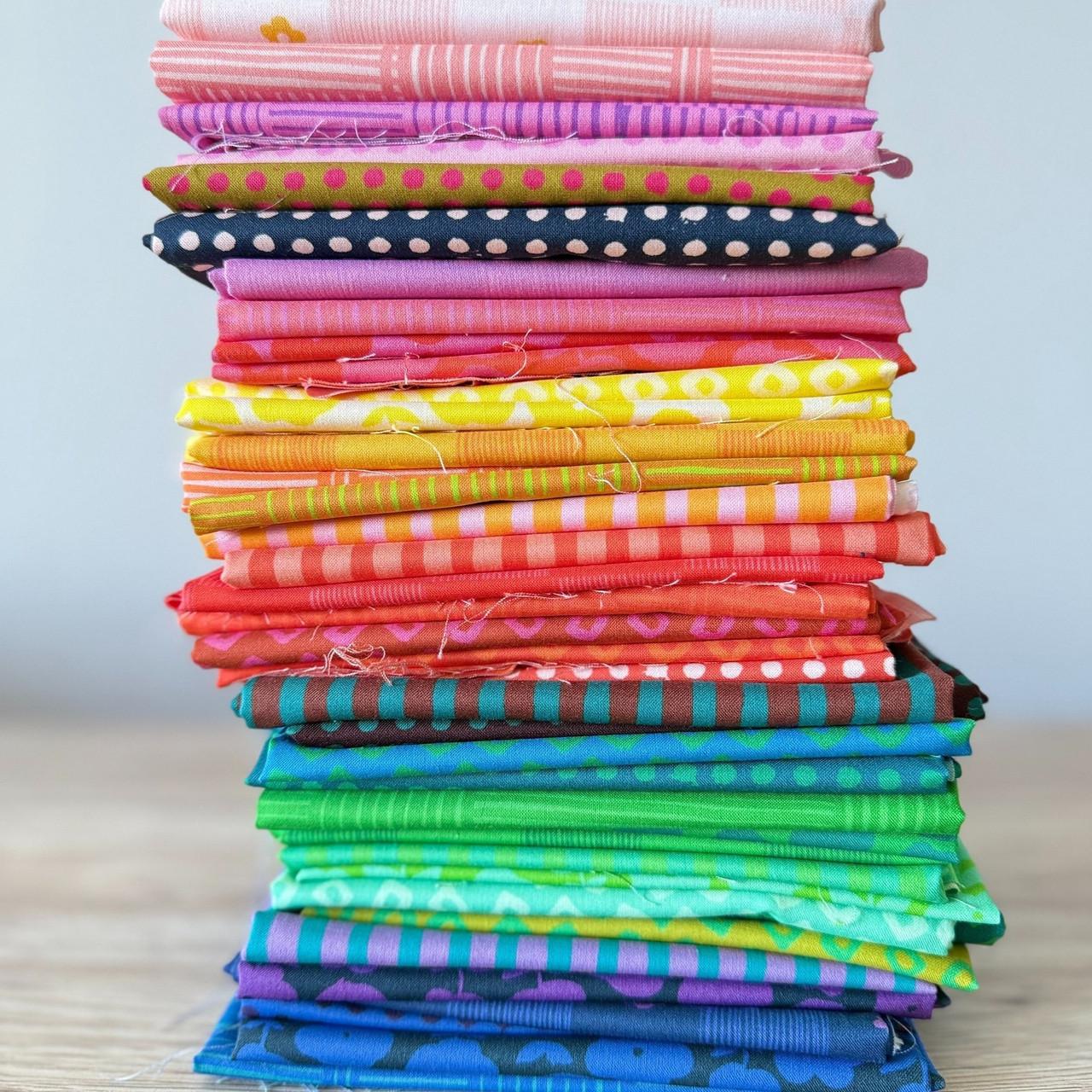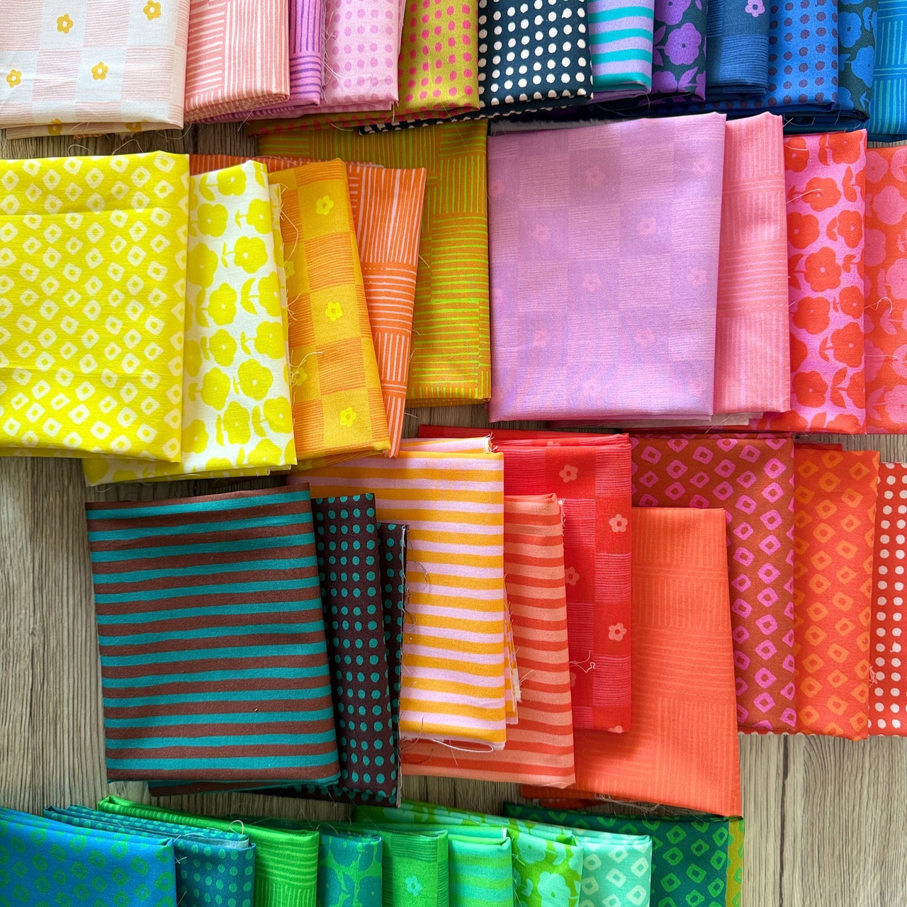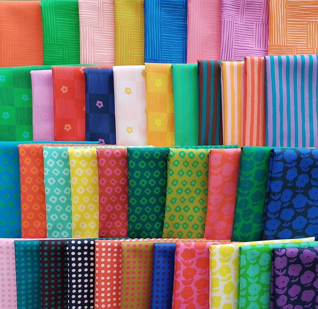 The Heather Ruby and Bee Blenders collection is a cheerful, saturated color palette mix with subtle florals, stripes and dots to create unique and versatile fabrics that add dimension and texture to quilts and other projects.