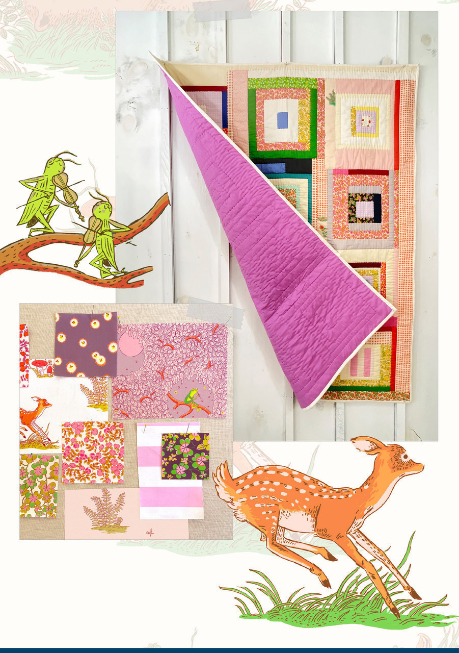 "Prints in this collection are inspired by Heather's daily life in Forestburgh NY: the pair of fawns that frequent the woods surrounding her studio, the apple trees that mark long ago homesteads, and the thick carpet of clover that makes for excellent barefoot afternoons wandering her own unkempt gardens. A bit more serious than many of her past collections, Forestburgh includes moody, earthy colors punctuated with bright greens and yellows. 27 designs in three colorways provide ample options for quilts, bedding, and much much more."