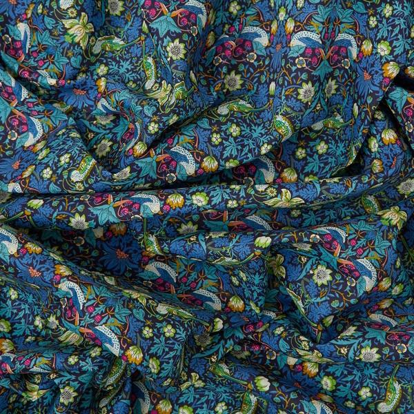 First printed by William Morris in 1883, Strawberry Thief was part of a group of designs incorporating animals with flowers. Introduced as a furnishing fabric for Liberty in 1979, it depicts birds stealing fruit within Morris’s Oxfordshire garden. 'Strawberry Thief' is now one of the most iconic LIBERTY OF LONDON prints. This dark Green Blue version with Purple fruits is one of our all-time favorite prints. So classy !