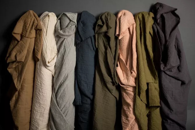 The reverse is a gauzy cotton, there is no batting in the middle of this cloth, the inside is made up of a series of thicker yarns which gives it the quilted feel. The top is a fine cotton. This construction gives the fabric a cushioned, textured hand while remaining flexible and breathable. If possible we would advise overlocking your raw edges before sewing to prevent fraying.