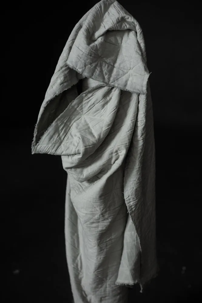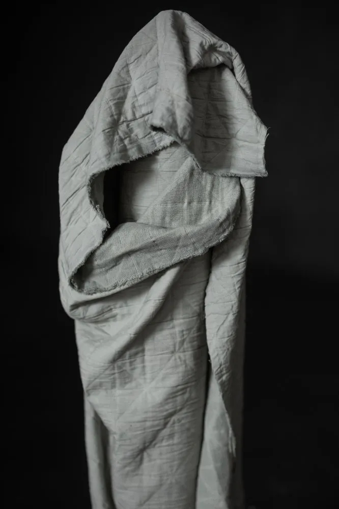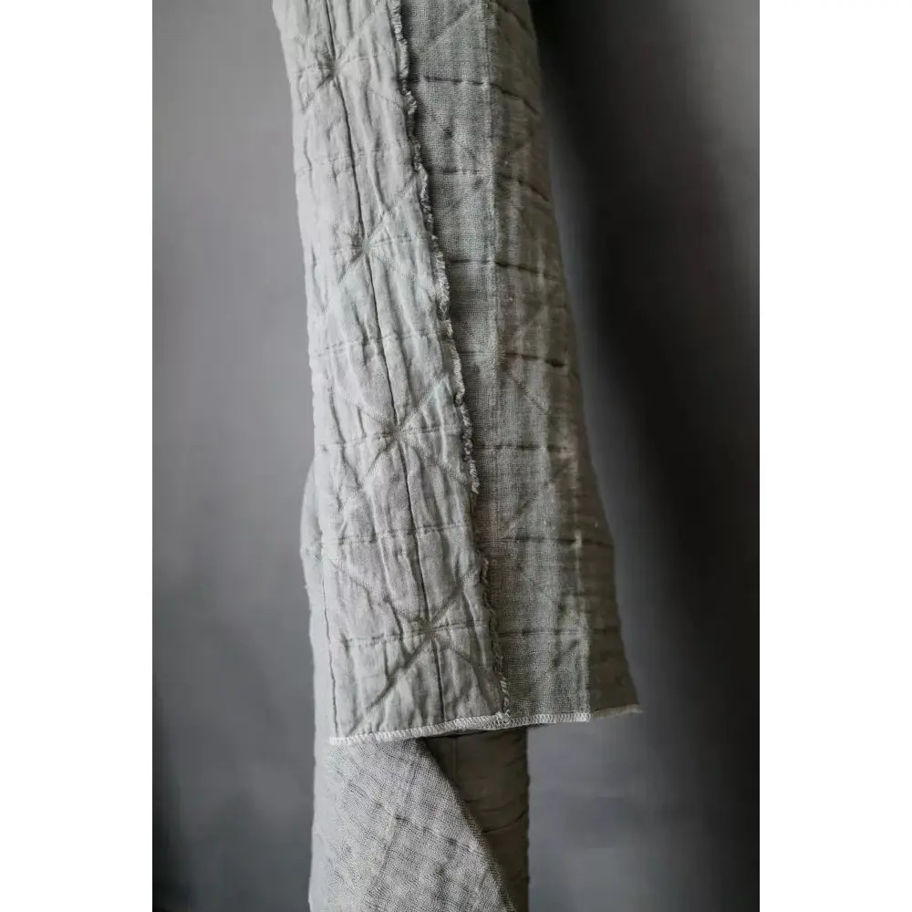 The reverse is a gauzy cotton, there is no batting in the middle of this cloth, the inside is made up of a series of thicker yarns which gives it the quilted feel. The top is a fine cotton. This construction gives the fabric a cushioned, textured hand while remaining flexible and breathable. If possible we would advise overlocking your raw edges before sewing to prevent fraying.