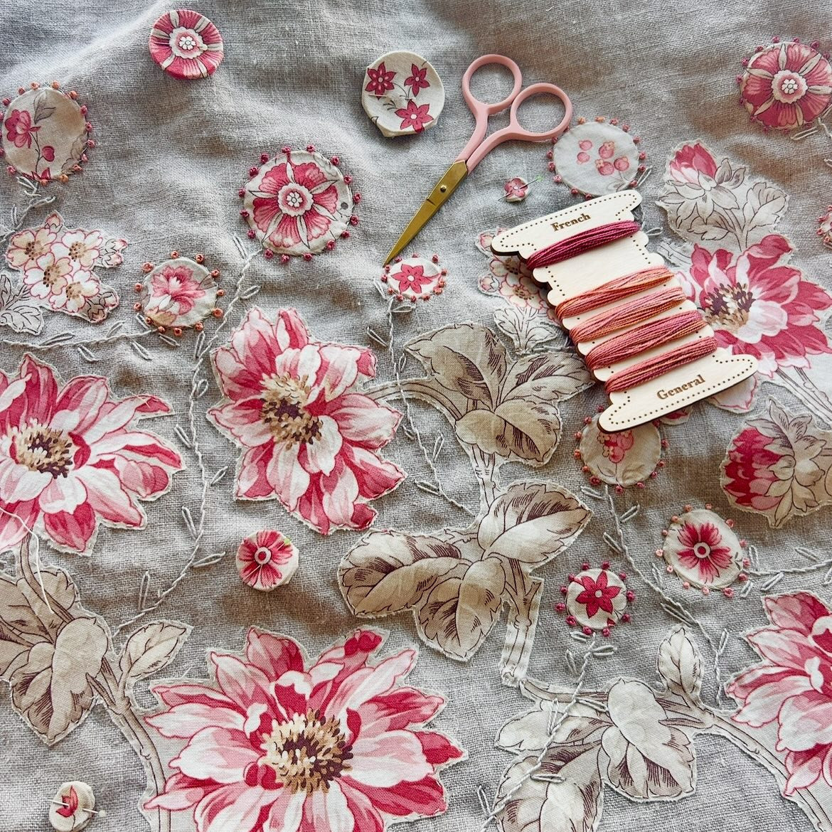 Joie de Vivre is a soft and subtle interpretation of early 19th century French prints and is evocative of an old French parlor room or a lady's dressing room. The larger multi-colored floral prints lend themselves to floral fussy cutting - a wonderful way to create pretty appliqués and hexagons. Out of all of the collections we have done in the past fifteen years with Moda, this is our very favorite and it will blend perfectly with our past collections. "