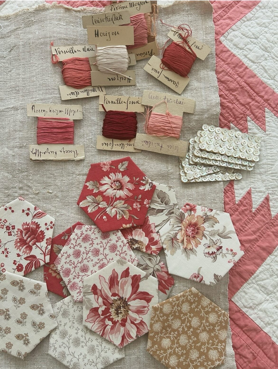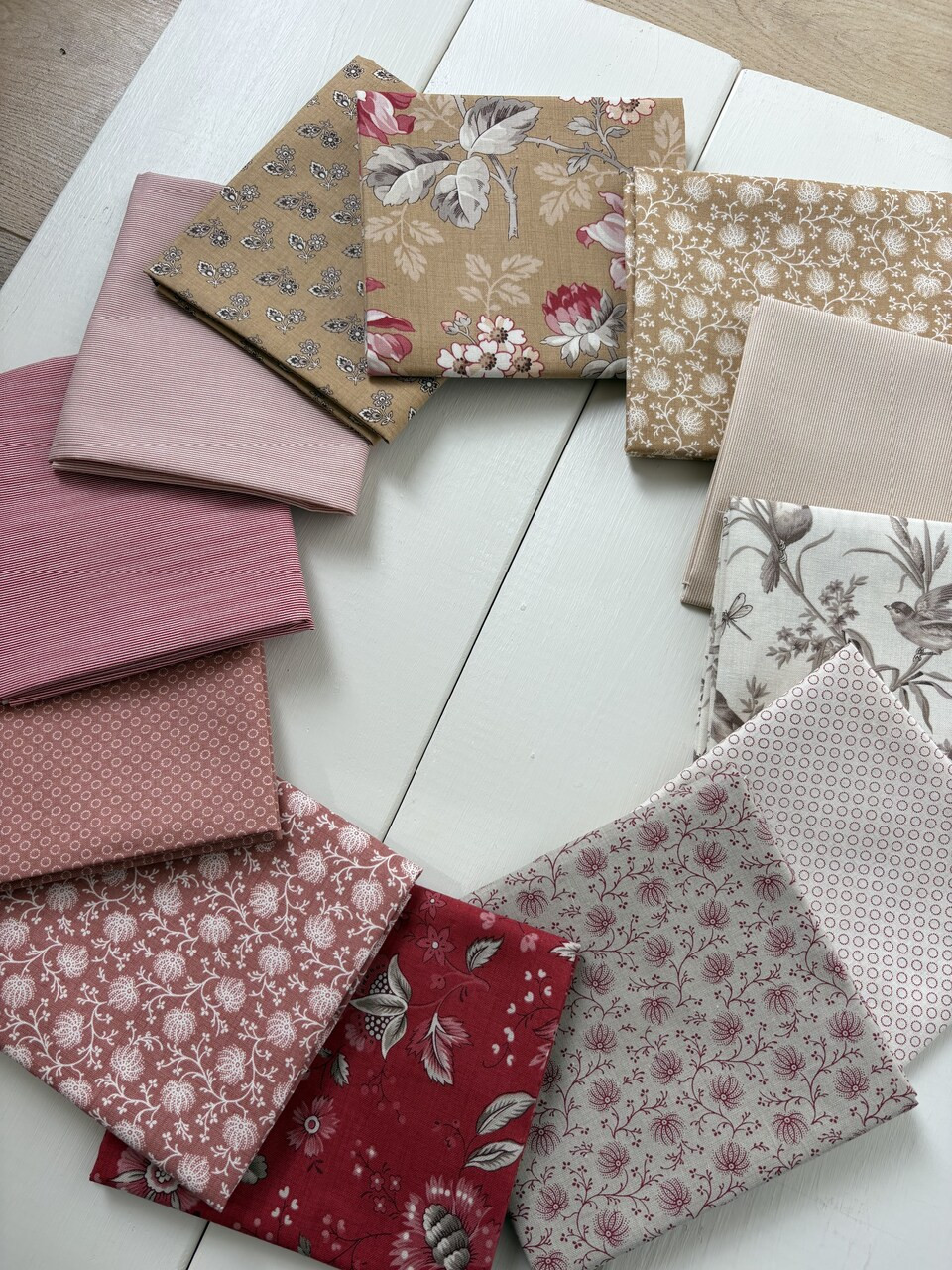Joie de Vivre is a soft and subtle interpretation of early 19th century French prints and is evocative of an old French parlor room or a lady's dressing room. The larger multi-colored floral prints lend themselves to floral fussy cutting - a wonderful way to create pretty appliqués and hexagons. Out of all of the collections we have done in the past fifteen years with Moda, this is our very favorite and it will blend perfectly with our past collections.