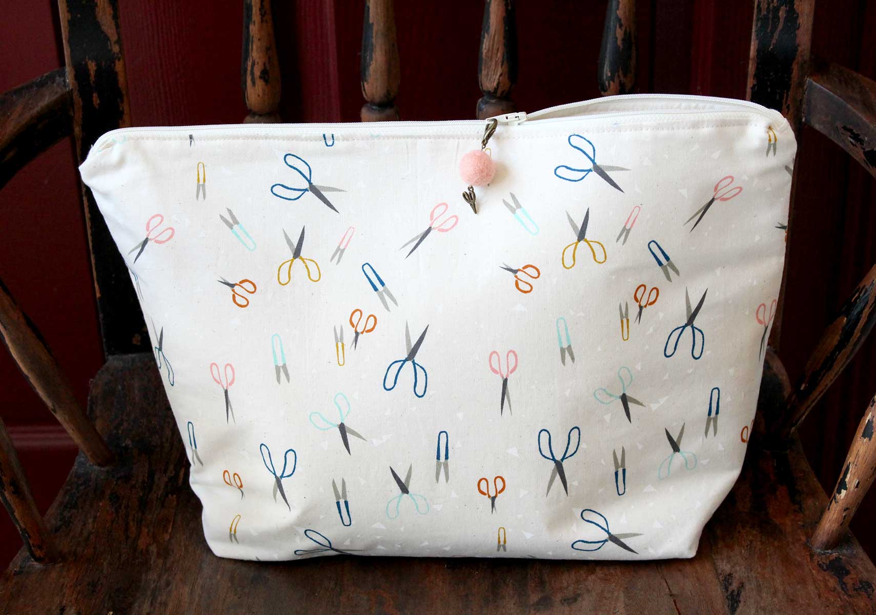 Any social stitcher will fall in love with this beautiful and functional zippered bag for transporting projects to any gathering! It’s the perfect size for storing small quilts in progress, several skeins of yarn, or any hand stitching project. The inside includes both large and small pockets for notions of all sizes and don’t forget the most adorable magnetic felt sweater that will securely store your favorite pair of tiny snips.