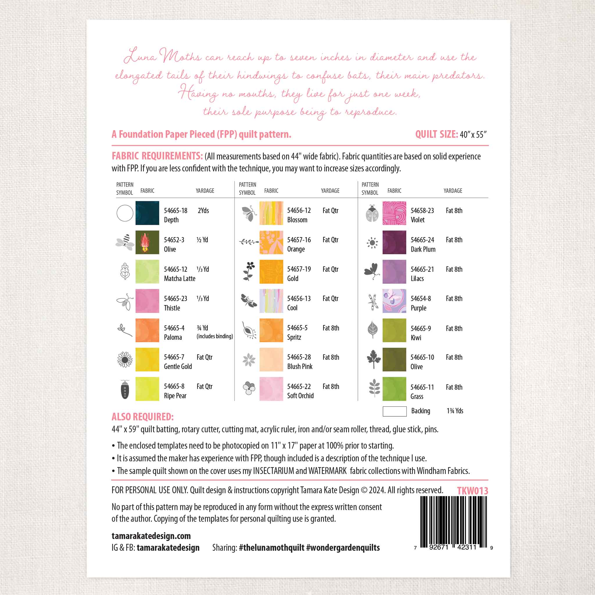 This listing is for a PAPER copy of THE LUNA MOTH Quilt Pattern printed using high quality paper. It is enclosed in a clear bag.