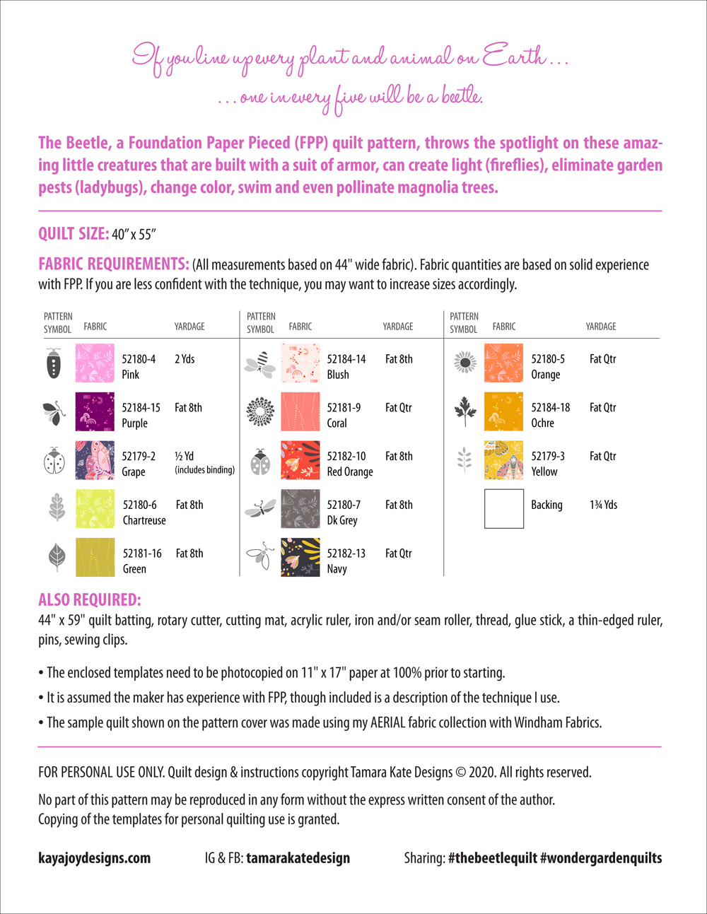 "The Beetle, the second in my new series of quilt patterns, WONDERGARDEN, throws the spotlight on these amazing little creatures that are built with a suit of armour, can create light (fireflies), eliminate garden pests (ladybugs), change color, swim and even pollinate magnolia trees. This is a Foundation Paper Pieced pattern." ~ Tamara Kate