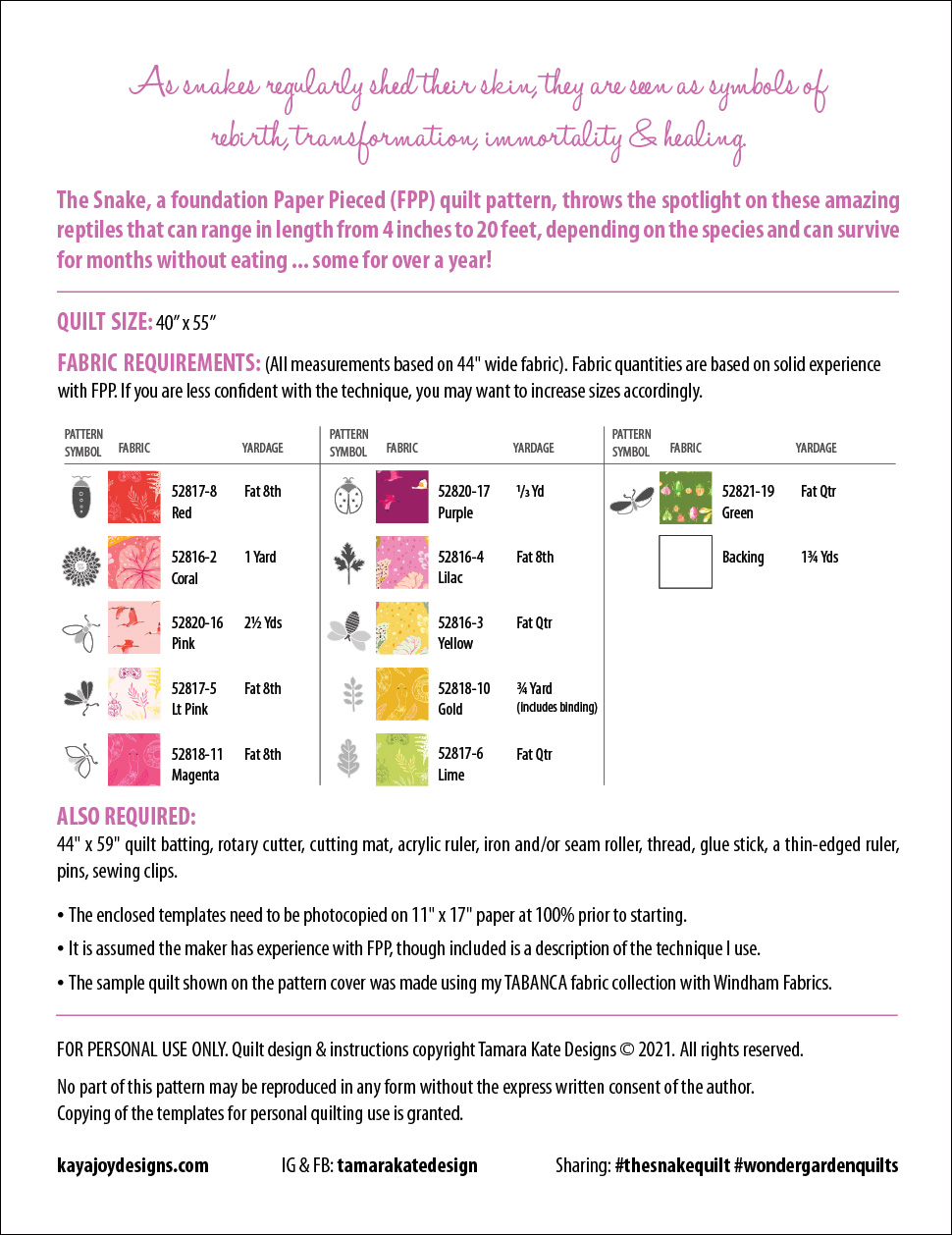 This listing is for a PAPER copy of the THE SNAKE Quilt Pattern printed using high quality paper. It is enclosed in a clear bag.